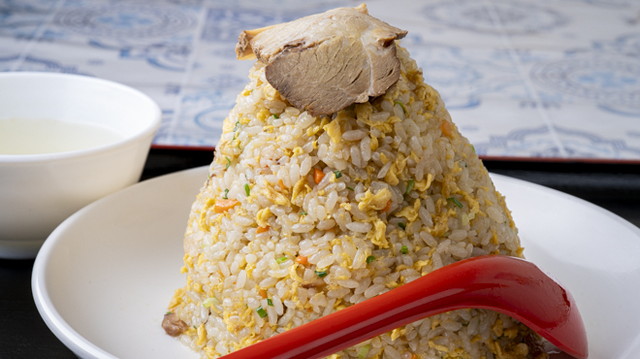 円錐状に高く盛られたインパクト抜群の一皿で、強火で炒めた香ばしい焼き飯をたっぷり楽しめます。