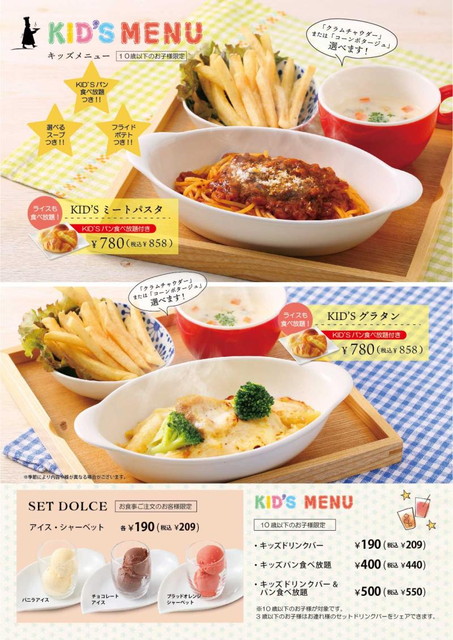 パン・ライス・食べ放題付きのランチメニューは以下の通りです。