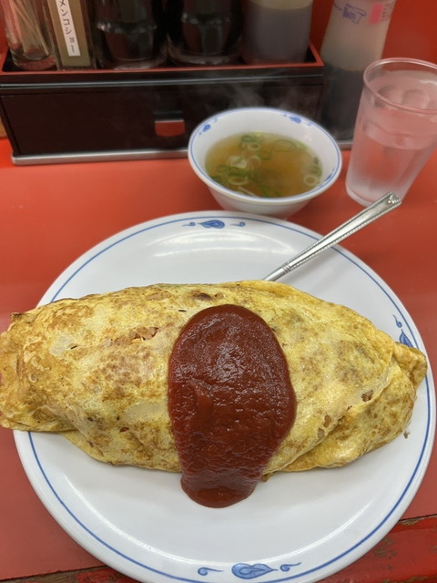 デカ盛り系として人気の「オムライス」は看板メニューのひとつ。ケチャップライスには海老や肉などの具材がたっぷり入り、しっかり味が染み込んだ仕上がりです。